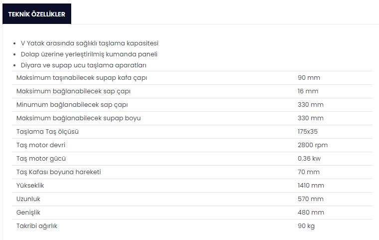 Supap taşlayıcı, supap taşlamasında yeni bi çığır açmakdır. Geleneksel pens veya torna bağlama aynası/kilit tertibatı yerine, "Çift V" çalışma sistemi çok keskin ve hassas neticeleri vermekte olup, kullanımı son derece kolaydır. Özgün supap kitleme sistemi çok geniş çeşitlilikte motorlarda uygulanabilirliğe sahiptir.